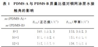 表1 PDMS-A與 PDMS-B質(zhì)量比值對銅網(wǎng)涂層水接 觸角的影響 m(PDMS-A)∶ m(PDMS-B) θCA(正己烷)/(°) θCA(甲苯)/(°) 8∶1 149.8±3.3 153.3±2.3 10∶1 151.6±2.4 153.6±3.6 12∶1 147.1±1.9 156.1±2.4 Sylgard184包含兩個組分,其中 PDMS-A 溶液為乙烯基封端的 PDMS,PDMS-B為甲基氫基硅氧 烷共聚物、含鉑催化劑、抑制劑所組成的固化劑。不同的 PDMS-A 與 PDMS-B配比影響 PDMS的固化 速率與固化程度,進而影響粒子的運動能力,因而影響成膜情況及涂層表面接觸角。另一方面,在成膜 過程中,溶劑的揮發(fā)速率也能影響粒子的運動,從而對膜的表面形貌及粗糙度造成影響。因此我們首先固定浸涂液組分為2.5gPDMS與3.125gSiO2,將 兩者溶解在50mL正己烷或甲苯溶液中,銅網(wǎng)在浸涂 液 中 的 浸 泡 時 間 為 5 min,銅 網(wǎng) 的 提 拉 速 度 為 0.05mm/s,涂層的固化溫度為80℃。改變PDMS-A 與 PDMS-B 的 質(zhì) 量 比,考察其對銅網(wǎng)涂層水接觸 角 (θCA)的影響,同時比較溶劑正己烷與甲苯對成膜后水 接觸角的影響。其結(jié)果見表1。