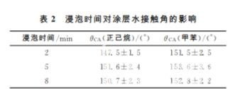 提拉前銅網(wǎng)在浸涂液中的浸泡時間同樣會影響疏水涂層的性能。因為銅網(wǎng)孔隙較小,需要足夠的 時間 才 能 使 銅 網(wǎng) 完 全 浸 潤。而若銅網(wǎng)浸泡時間過長,PDMS固化反應在溶液中大量發(fā)生,形 成 交 聯(lián) PDMS網(wǎng)絡(luò)的過程可能會影響SiO2粒子的吸附和分布,從而影響銅網(wǎng)的疏水性。因此實驗研究了浸泡時間對涂層水接觸角的影響,分別將銅網(wǎng)浸泡2,5, 8min后,以0.05mm/s的速度提拉成膜,涂層的固 化溫度為80 ℃。測得水在銅網(wǎng)涂層表面的接觸角 見表 2。 可 見,無 論 采 用 正 己 烷 還 是 甲 苯,浸 泡 5min得到的疏水銅網(wǎng)的水接觸角最高。因此選擇5min為最佳浸泡時間。