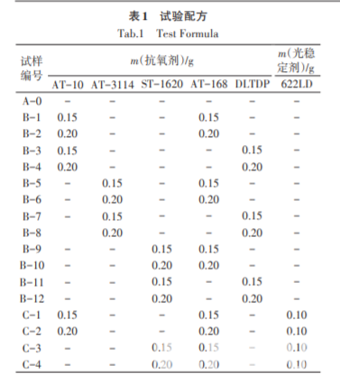 將 100 份 C5 石油樹脂與不同比例復配的抗氧 劑 和 光 穩 定 劑 在 三 維 運 動 混 合 機 中 高 速 混 合 10 min,然后用電熱爐加熱熱熔后,迅速冷卻后待 用。試驗配方如表1所示。