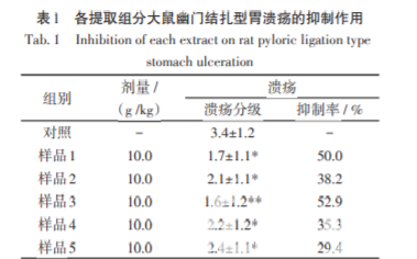 用藥效結(jié)果 各提取組分對大鼠幽門結(jié)扎型胃潰瘍的抑制 作用藥效試驗結(jié)果用t值法進行統(tǒng)計分析,結(jié)果見 表1。
