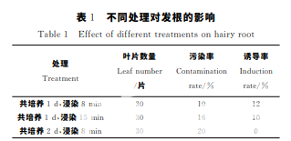 由于翼首草的葉片為草質(zhì)且?guī)в泻芏嘞倜?共培后易感染菌,所以確定一個合適的共培與浸 染時間對于優(yōu)化翼首草發(fā)根誘導(dǎo)較為重要。共培 養(yǎng)1d浸染8min效果較好,誘導(dǎo)率為12%。隨 著浸染時間與共培時間增加,翼首草葉片的受損 與長菌的幾率增加如表1所示。