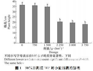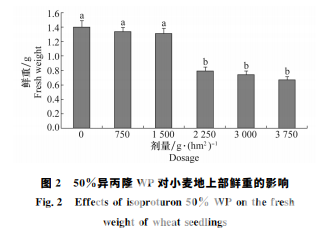 藥 后 5d目 測 觀 察,50% 異 丙 隆 WP750~ 3750g/hm2 處理區(qū)小麥生長正常,株高、葉色等指標 與清水對照處理相比沒有明顯差異。隨著時間的推 移,藥后10d調查時,50%異丙隆 WP750、1500g/hm2 處理區(qū)小 麥 生 長 正 常,未 見 異 常,但 2250、3000、 3750g/hm2 處理區(qū)小麥葉片發(fā)黃,植株明顯矮化, 小麥的株高和地上部鮮重比清水對照處理分別下降 了43.96%、46.70%、50.55%和43.57%、47.14%、 52.14%,藥害明顯(圖1~2)。