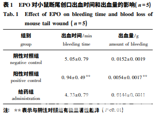 用斷尾法測定 EPO 對(duì)小鼠體表創(chuàng)口出血時(shí)間和出血量的影響。
