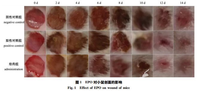 選取 SPF 清潔 級(jí)昆明雄性小鼠 60 只,隨機(jī)分為 3 組,每組 20 只,分別為陰性對(duì)照組、云南白藥陽性對(duì)照組和 EPO 給藥組。將小鼠用 10%水合氯醛腹腔麻醉后, 背部剃毛、消毒。在小鼠背部剪去直徑約 0. 8 cm 的全層皮膚,造成全皮層創(chuàng)傷動(dòng)物模型。每只小鼠 均分籠飼養(yǎng),給藥組每天涂抹 30 ~ 35 mg EPO ( 肽 含量為 1. 5 ~ 2. 5 mg) ,陽性對(duì)照組每天涂抹 2 ~ 3 mg 云南白藥,陰性對(duì)照組不做任何處理。每 2 天 對(duì)小鼠創(chuàng)傷口面觀察、拍照、測量傷口大小,并記 錄結(jié)果。
